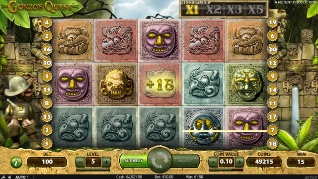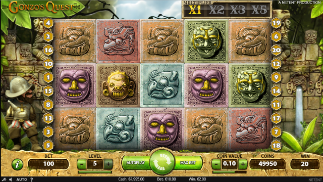 Азартный слот Gonzo’s Quest на приключенческую тематику, главный персонаж которого испанский конкистадор Гонзо. Перед началом игры гэмблер увидит мини-ролик, рассказывающий предысторию событий, в которых будет участвовать игрок. Герой постоянно присутствует на экране, он контролирует спины и реагирует на происходящее.