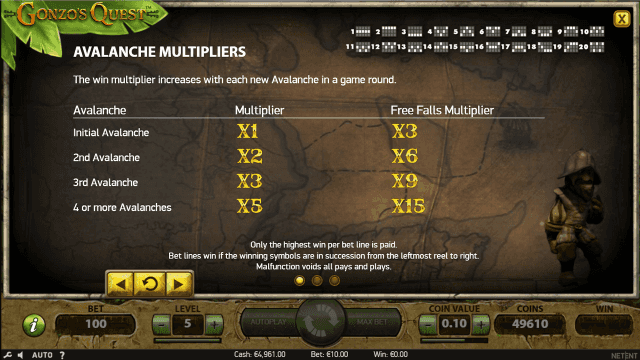 Барабаны симулятора работают по принципу лавины. Ячейки в нем не вращаются, а падают. На месте выпавших картинок появляются новые. При этом к награде за сформировавшуюся последовательность прибавляется множитель от х1 до х5. Его размер с каждым непрерывным выигрышным вращением увеличивается на одну цифру. После проигрышного спина мультипликатор опускается до х1.